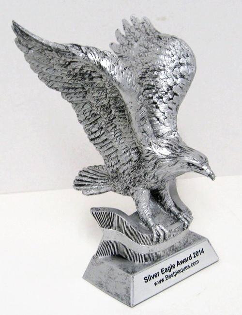 Our high quality silver resin eagle sits on a large silver base.
